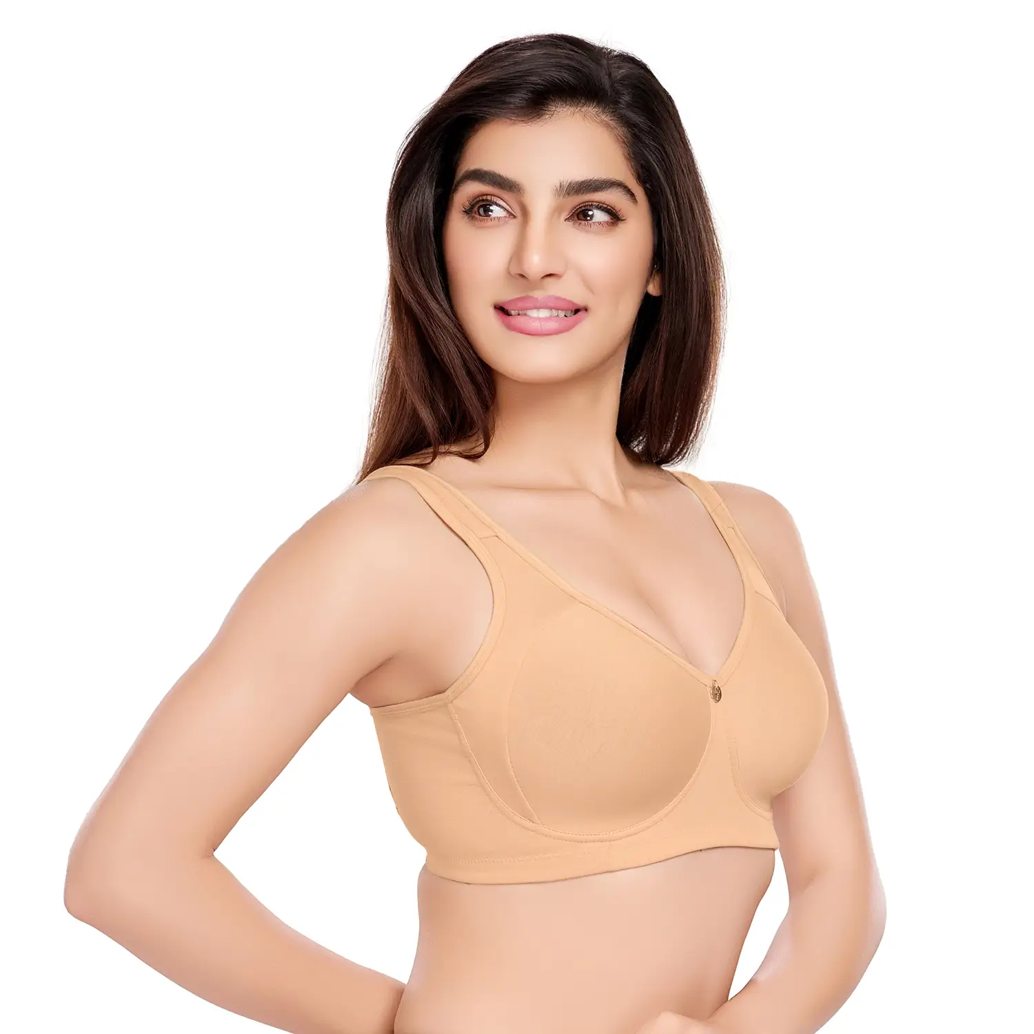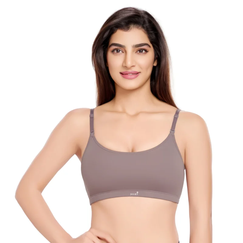 Crafted from soft, stretchable cotton elastane fabric, this bra features gently padded foam cups for natural shaping and a wire-free design for all-day comfort. An elegant metal center detail adds a subtle feminine charm, making it perfect for everyday wear.